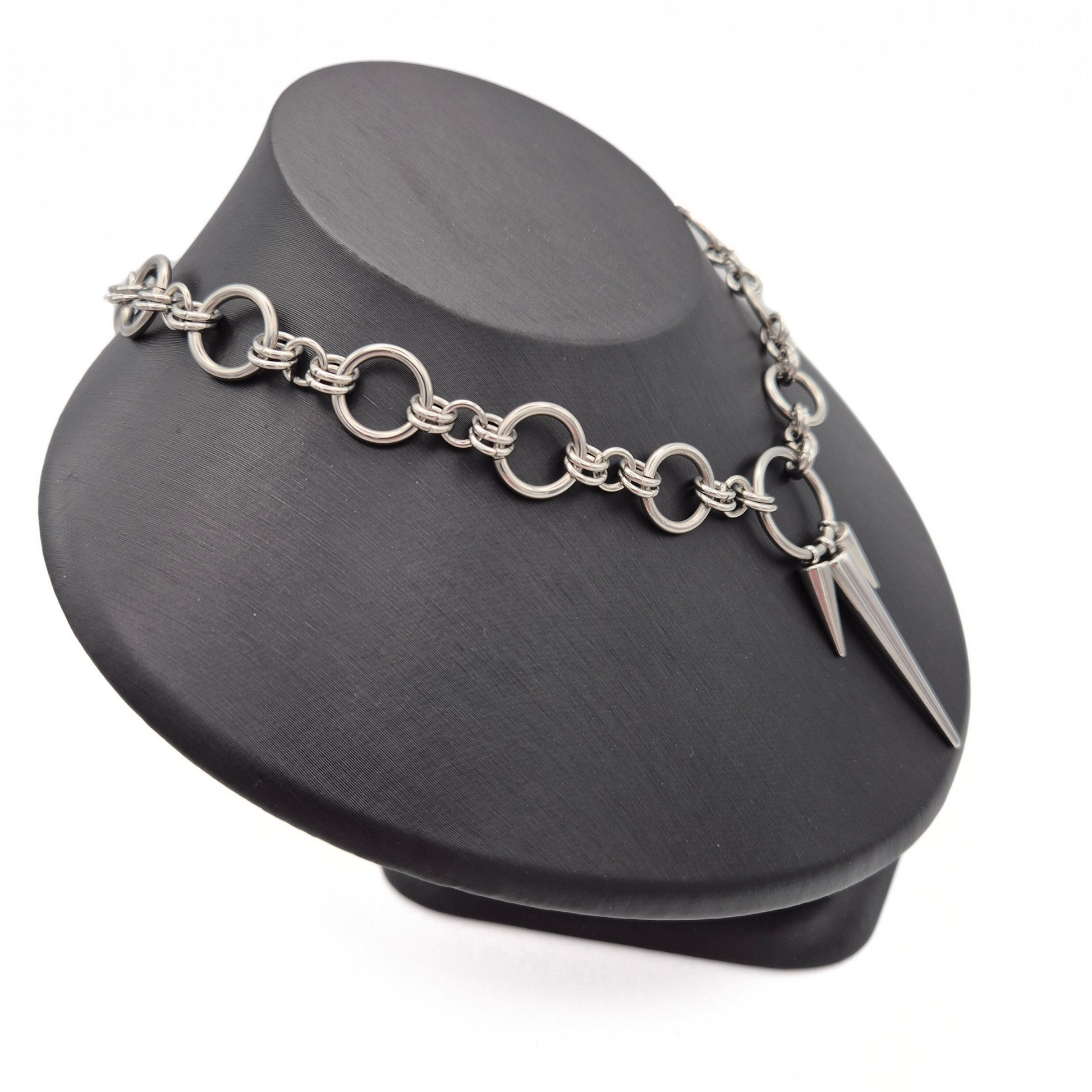 The Severance pairs a chunky stainless steel chain with a central ring and three polished spike drops. Clean lines and sharp edges give it a deliberate, controlled feel — bold without being overdone.